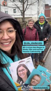 Haustürcanvassing mit Marie Wasem in Begleitung von Ruth Stauder und Georg Beer in Nieder-Olm. Auch das schlechte Wetter schreckt uns nicht ab. Und die Banner konnten aufgestellt werden. Danke an die Helferlein.